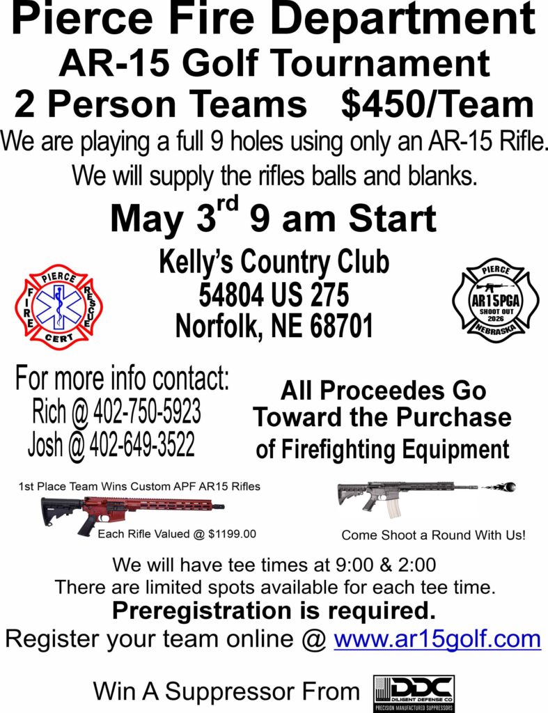 The 2026 Pierce Fire Dept. AR-15 Golf Tournament May 3rd 2026 Kelly's Country Club Tee Times @ 9:00 & 2:00